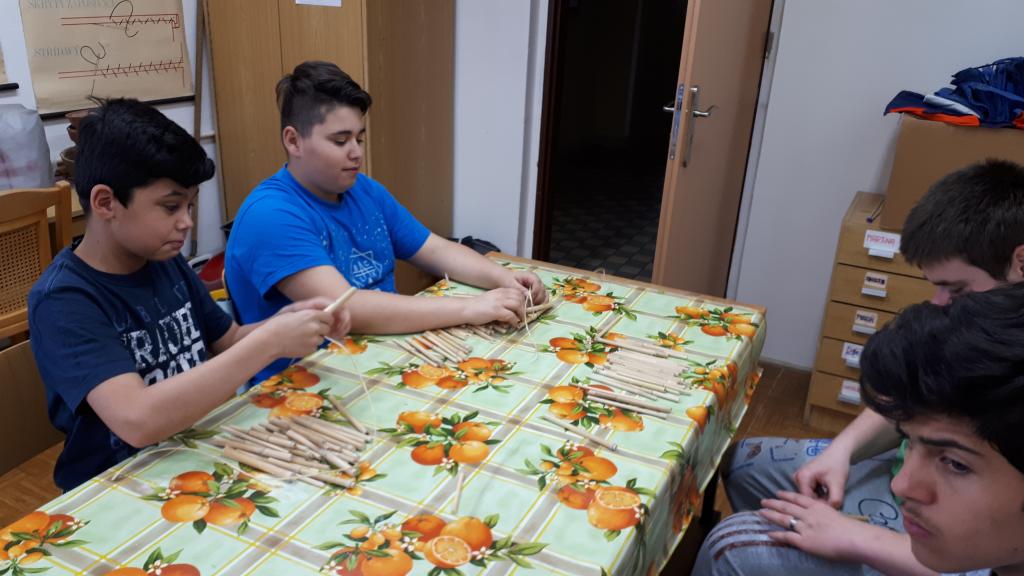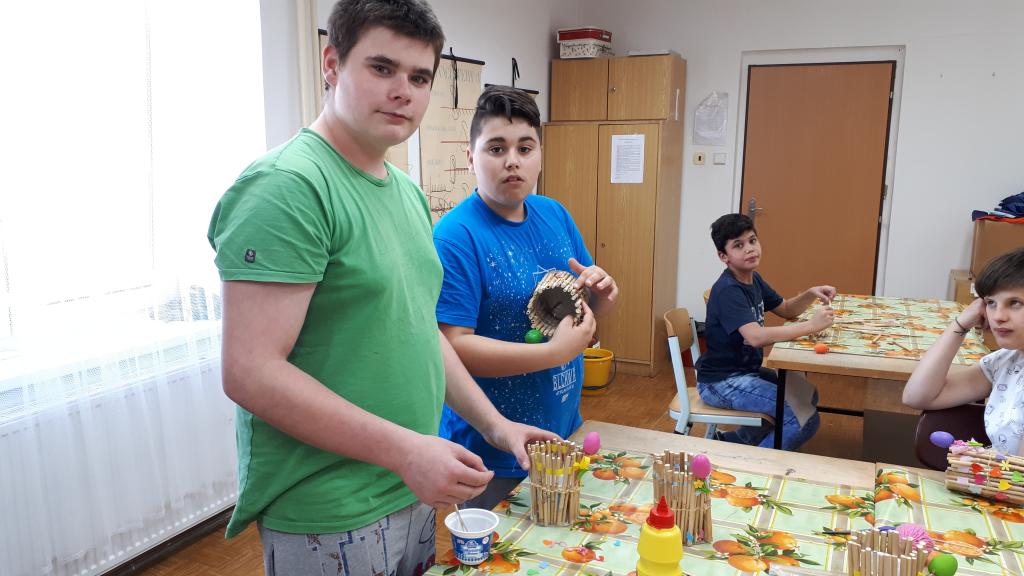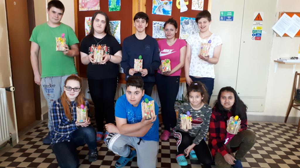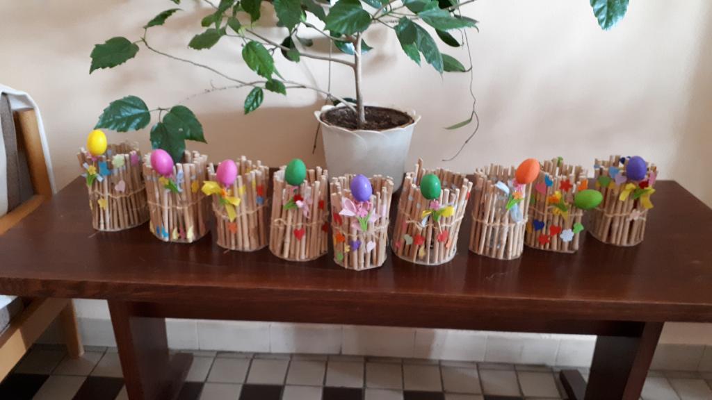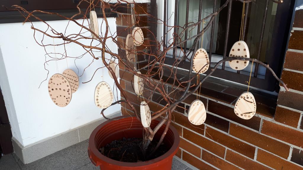 Jedna skupina žáků vyráběla dřevěná závěsná vajíčka, která žáci zdobili vypalováním do dřeva. Nyní máme nám zdobí vchod do školy. Druhá skupina dětí tvořila ozdobné květináčky z bambusu, které děti odekorovaly jarními motivy. A ty zase uvidíte ve vstupní chodbě do školy.