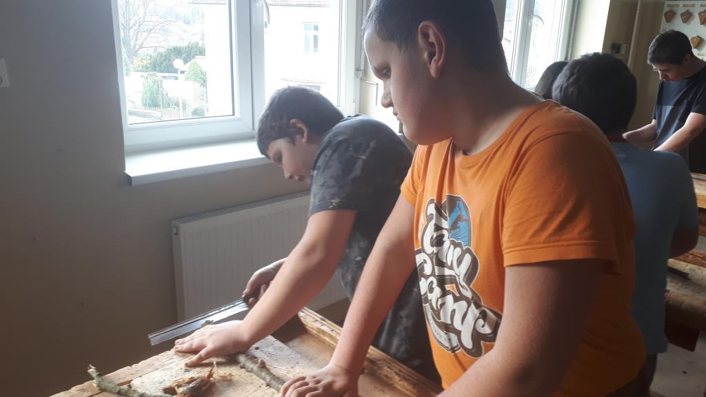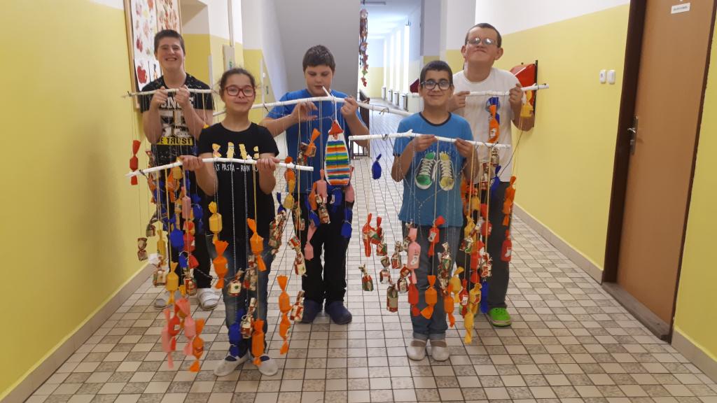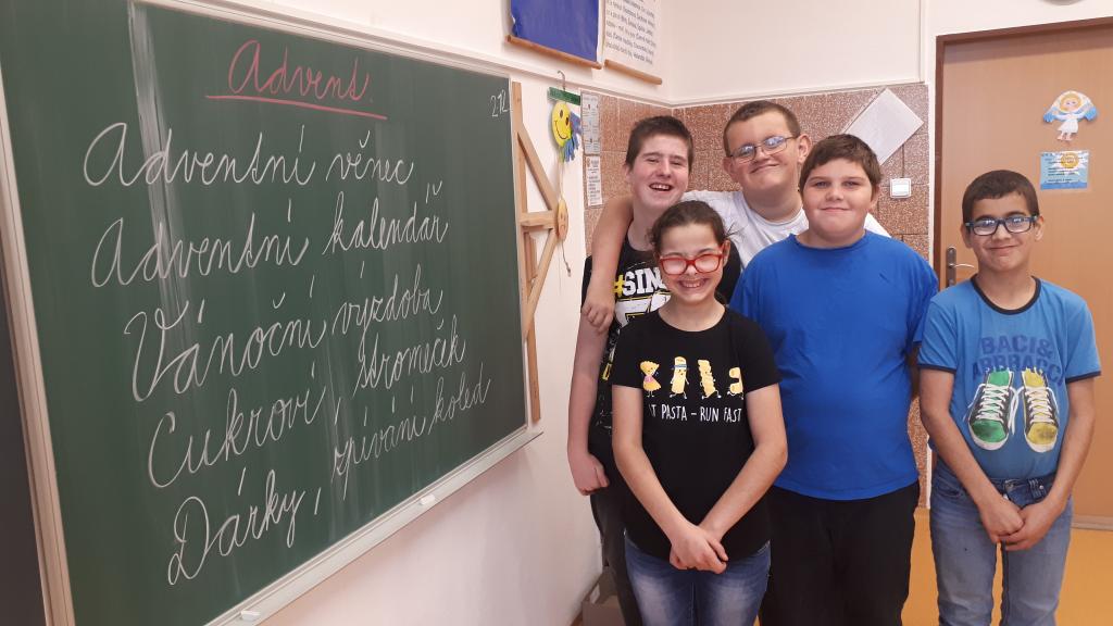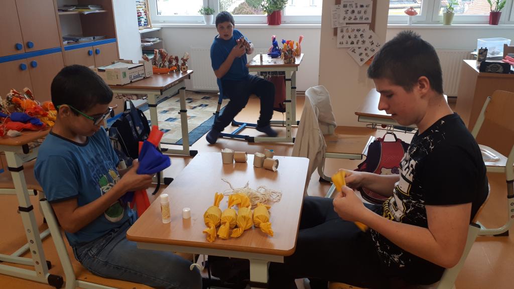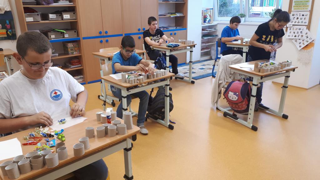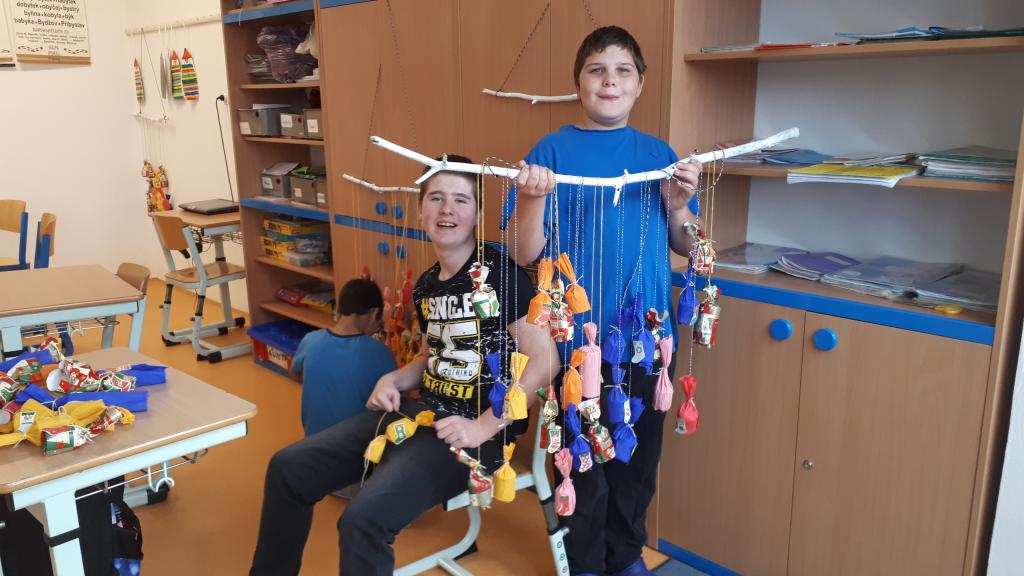 Výroba adventního kalendáře. Žáci si vyrobili adventní kalendář na každý den do Vánoc. Použili jsme ruličky toaletního papíru, balicí papír, krepový papír a větvičku, kterou jsme předem nabarvili na bílo. Všechny vyrobené balíčky, do kterých si žáci zabalili sladkosti, jsme pověsili na připravenou větvičku.