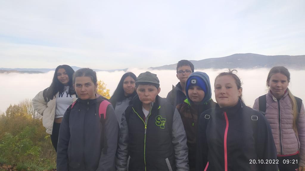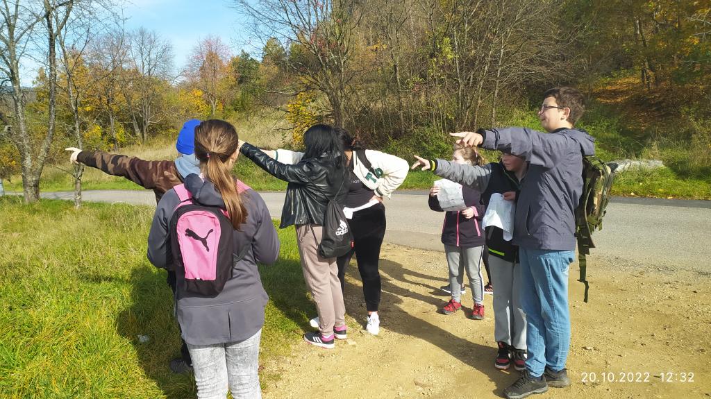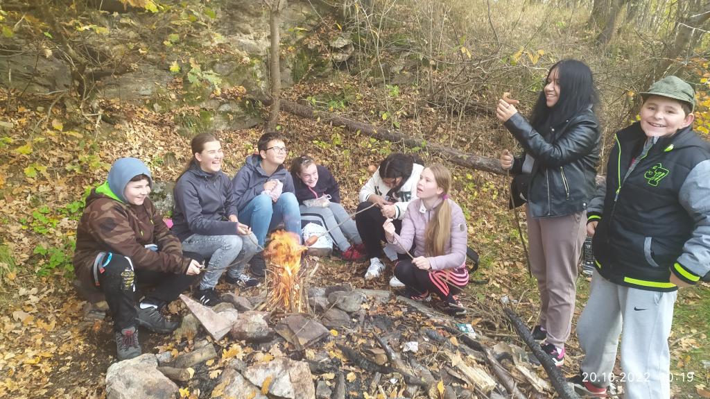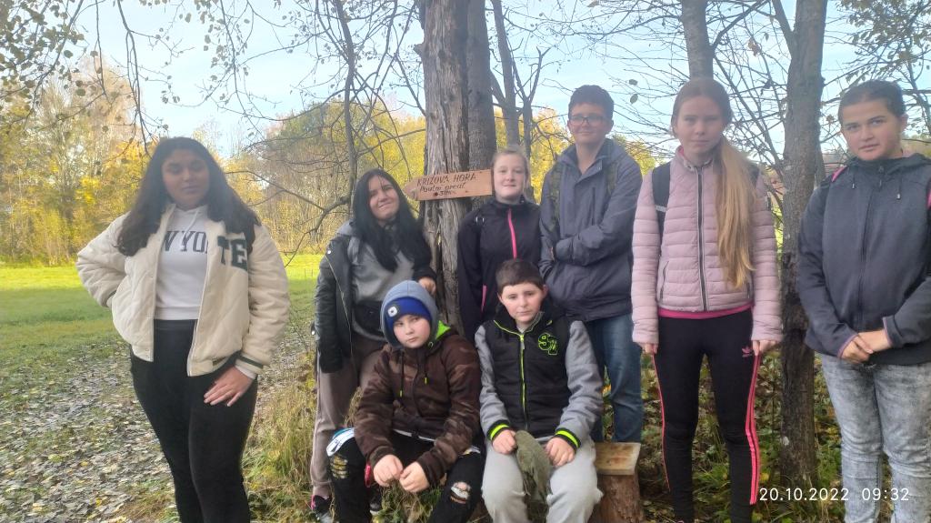 Po zvonění se žáci seznámili s průběhem projektového dne a s dodržováním zásad bezpečnosti. Šli jsme na Křížovou horu. Vysvětlili jsme si inverzi počasí. U kaple se žáci učili orientovat na mapě, orientovali mapu podle kompasu. Určovali světové strany. Podle měřítek mapy odhadovali vzdálenosti. Poznali turistické značky. Po modré jsme došli téměř k ohništi. To jsme zmenšili podle vlastních potřeb. Žáci nasbírali suché dříví, další připravili pruty na opékání uzenin. Vysvětlili jsme si zásady rozdělávání a likvidace ohně v přírodě. Později jsme šli po neznačené cestě do Slupence. Žákům jsme ukázala orientaci v terénu na aplikaci Mapy.cz v mobilu. Za Slupencem u lesa jsme viděli Český Krumlov. Cestou zpět ke Křížové hoře jsme pozorovali změny v podzimní krajině. Zvířat jsme moc nepotkali, pouze mravence, škvory a přejetou veverku. Ve Slupenci jsme viděli jezdecké koně. Stromy a keře žáci poznávali podle listů. Z hub jsme viděli několik druhů chorošů, holubinek, pýchavku a několik dalších hub, které nikdo neznal. U Křížové hory žáci opakovali a procvičovali práci s mapou a odhady vzdáleností. Ušli jsme téměř 8 km.
