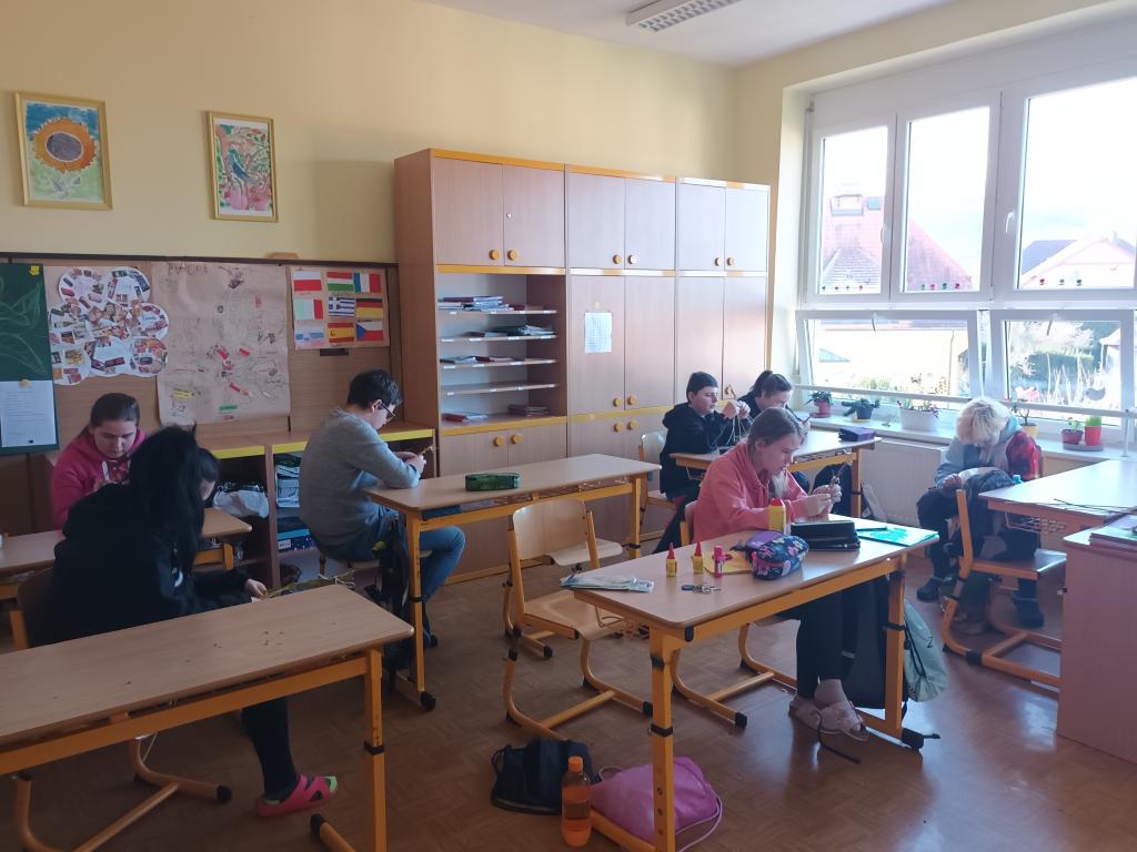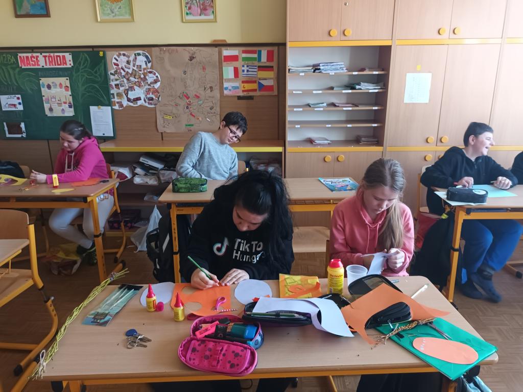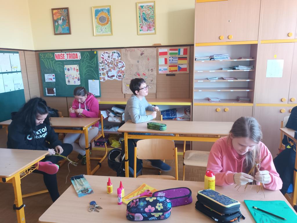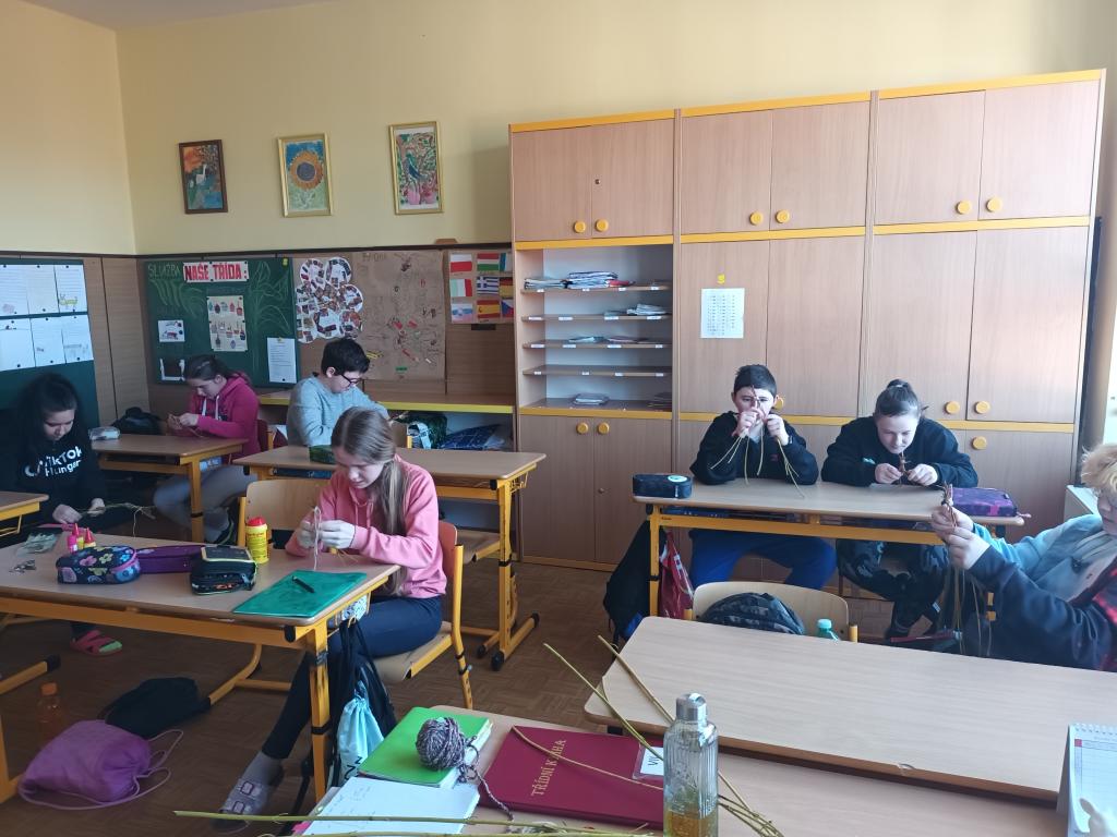 Projektový den VII. třídy. Začali jsme pletením pomlázky. Pro mnohé žáky to bylo poprvé, kdy si tuto aktivitu mohli vyzkoušet. Všem se dílo podařilo a měli jsme krásné výtvory na koledu. Poté jsme vyráběli vejce z papíru a také zdobili vyfouklá slepičí vajíčka metodou decoupage.