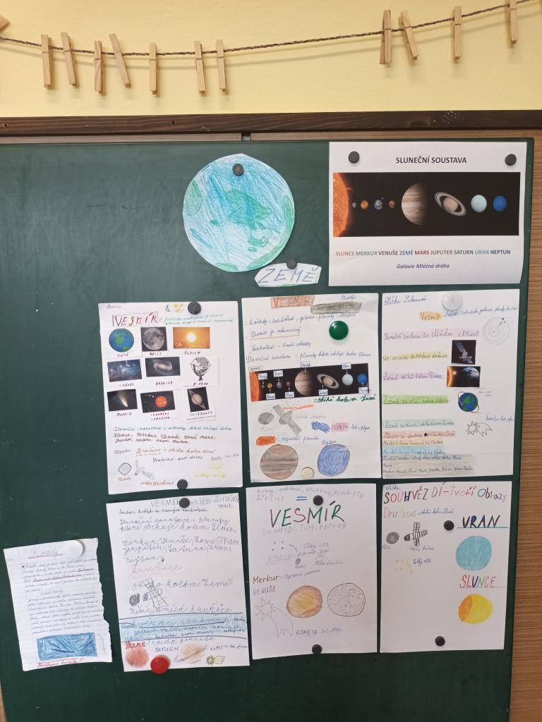 Ve fyzice probíráme naší sluneční soustavu. Proto jsme si udělali den s vesmírem. Naučili jsme se co jsou družice, z čeho se skládají komety i co je osa Země. Namalovali jsme všechny planety sluneční soustavy. V závěru dne jsme si zahráli vesmírné domino.