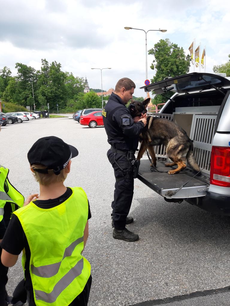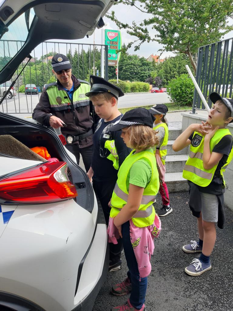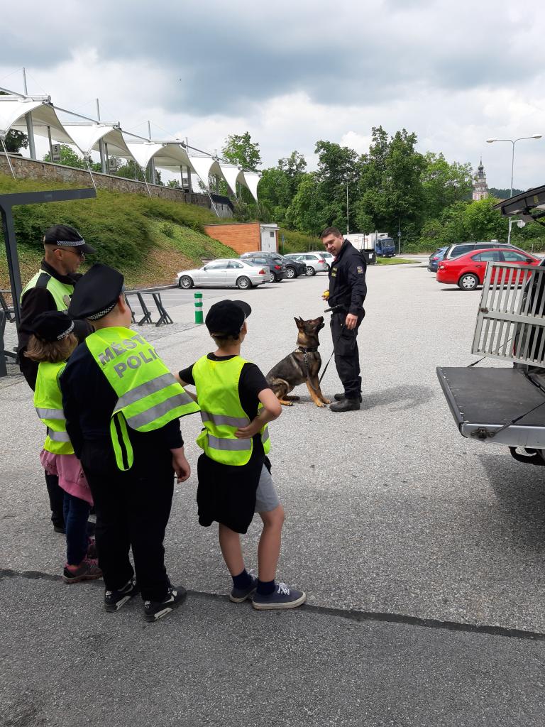 Dne 9.6. se III. třída vydala na Městskou policii. Pan Šebela nám ukázal, co nosí pan policista ve službě, jak vypadá stanice a poté jsme se vydali do ulic, kde jsme rozdali několik pokut a vyzkoušeli si rozhovor v případě, kdyby se někdo ztratil. U policejní stanice jsme si prohlédli služební auto. Na závěr jsme měli štěstí a pan Šebela nám domluvil krátkou ukázku práce s policejním psem.