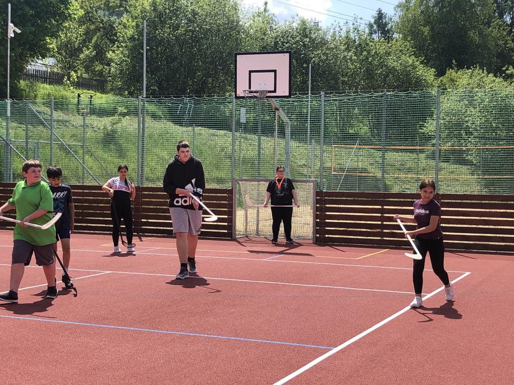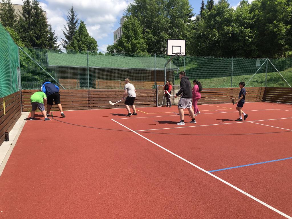Na venkovním hřišti si žáci zahráli florbal s prvky hokeje.