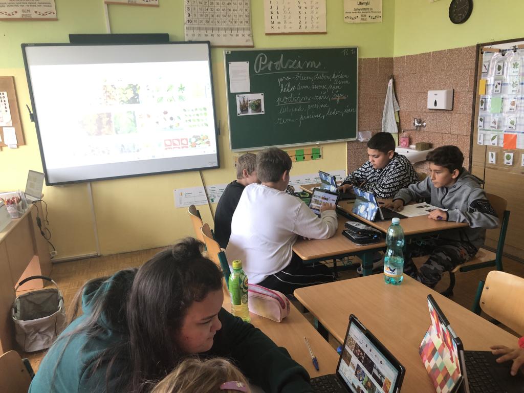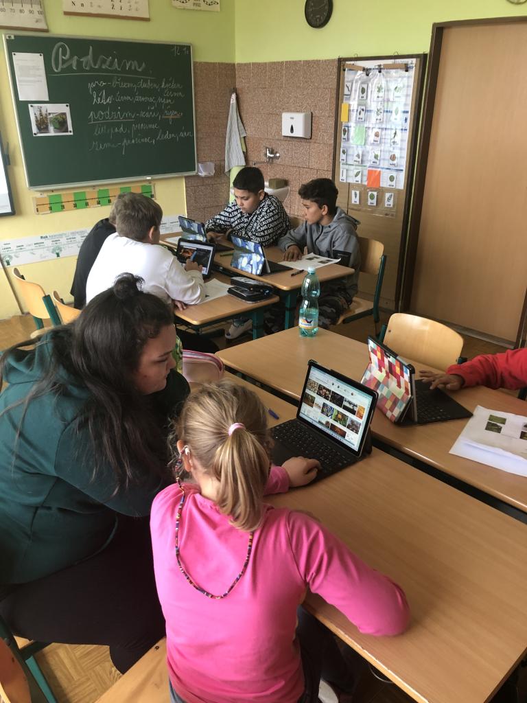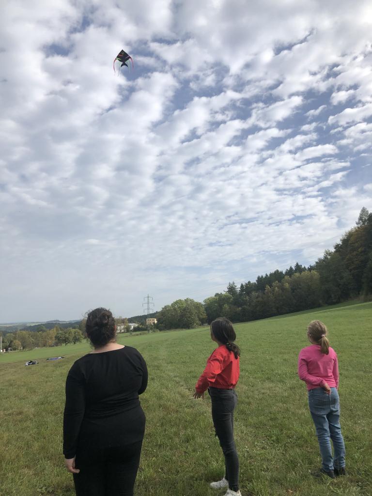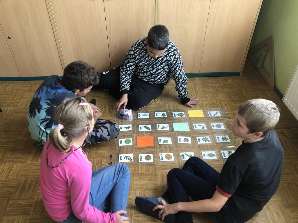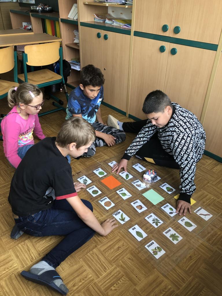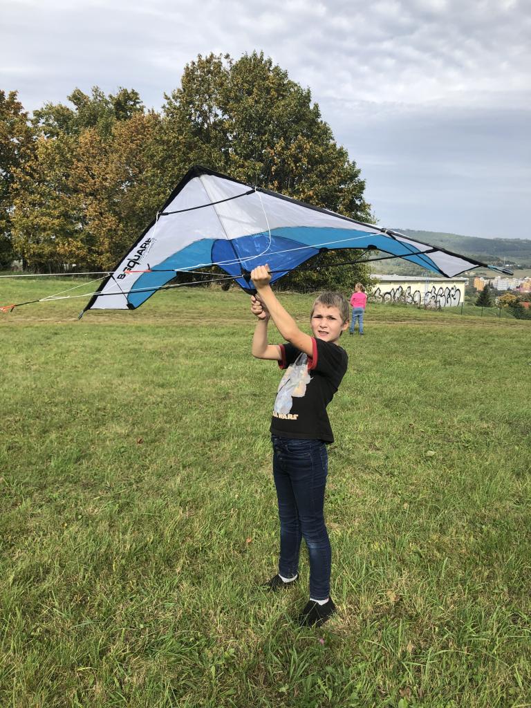 Žáci si pomocí tabletů vyhledávali názvy stromů podle obrázků listu. Dále vyhledávali a zapisovali do pracovních listů jehličnaté stromy a určili, který strom v zimě jako jediný opadává. Dalším úkolem bylo pomocí robota Blue Boota spojit, na připraveném podkladu, list a plod stromu. PD jsme ukončili pouštěním draků pod Křížovou horou.