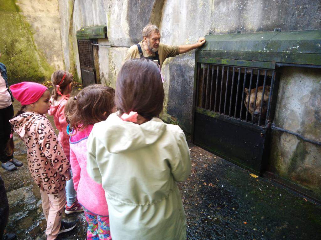 Pan medvědář nás vzal do výběhu. Ukázal nám, jak se medvědi krmí a čím a pohrál si s nimi za nás.