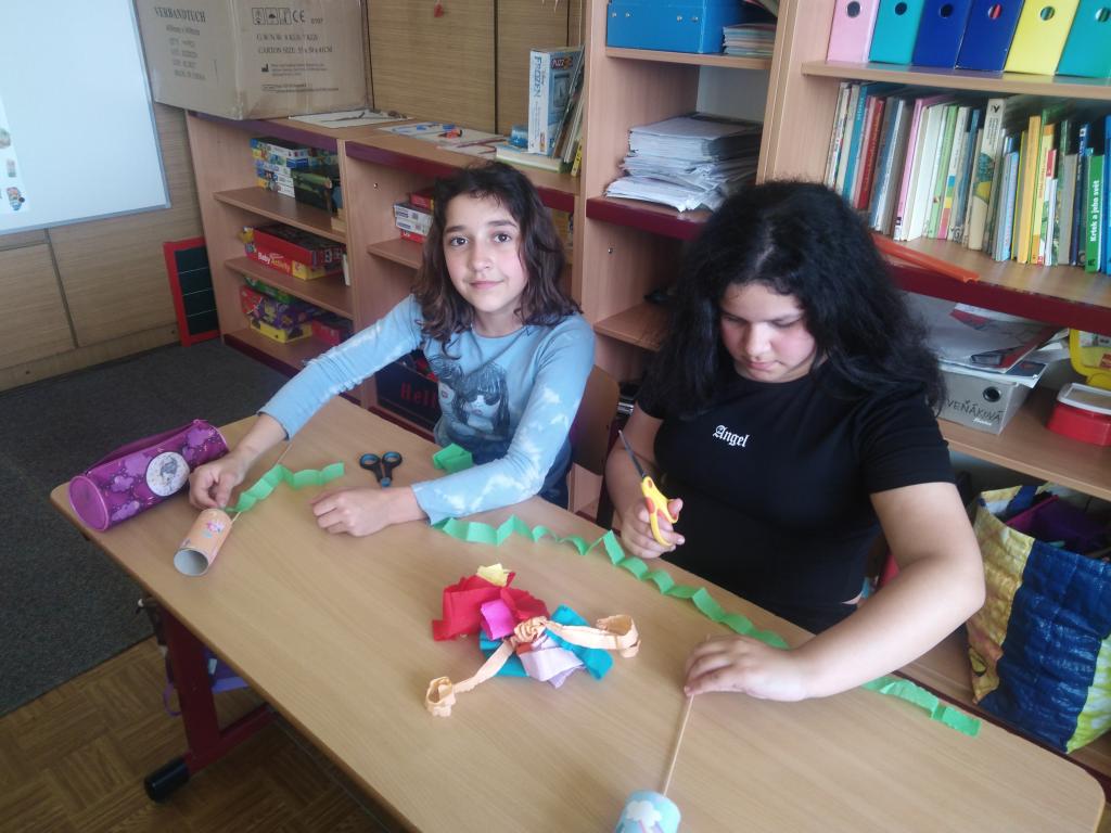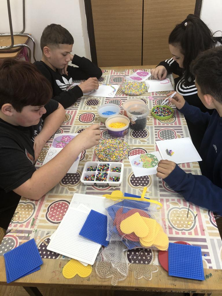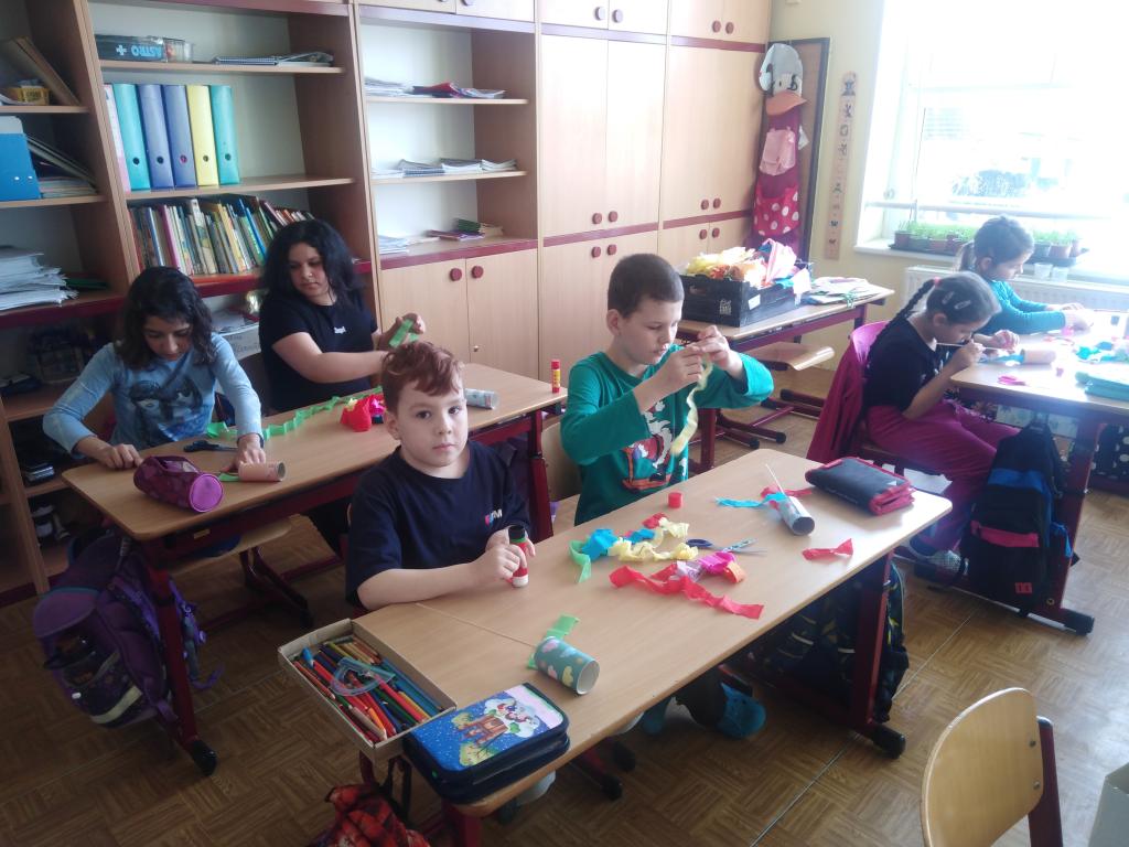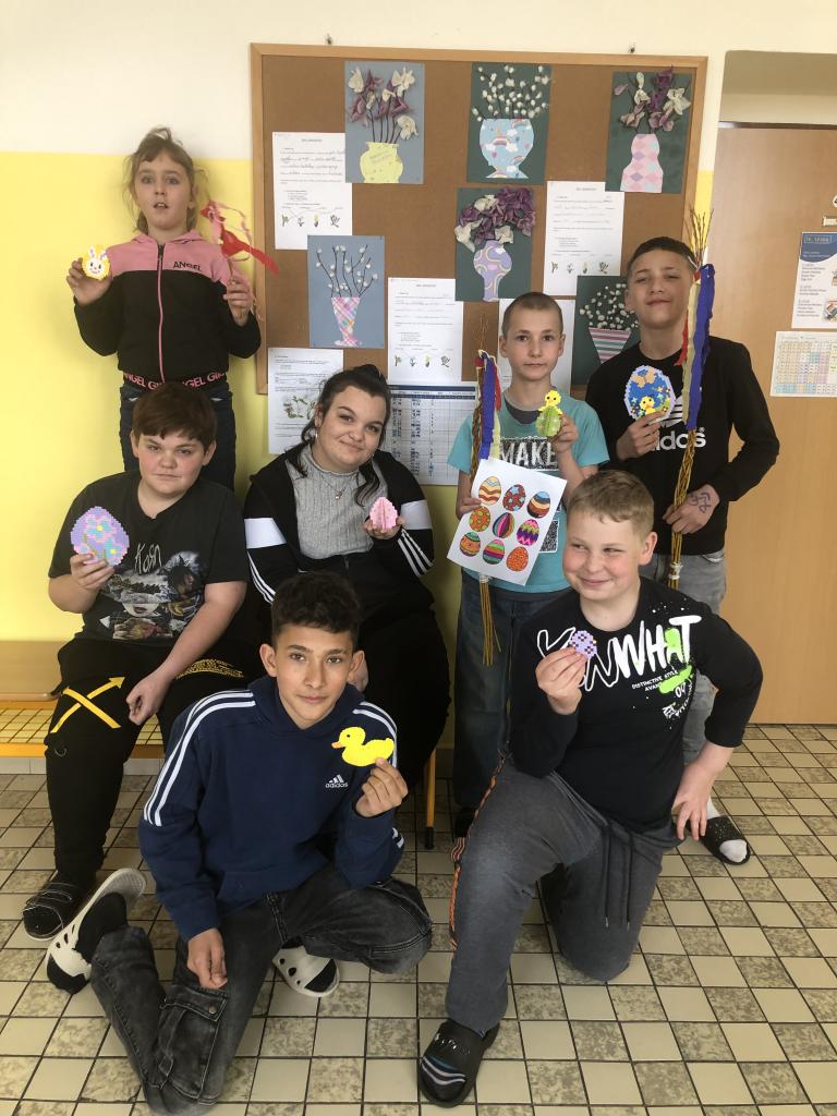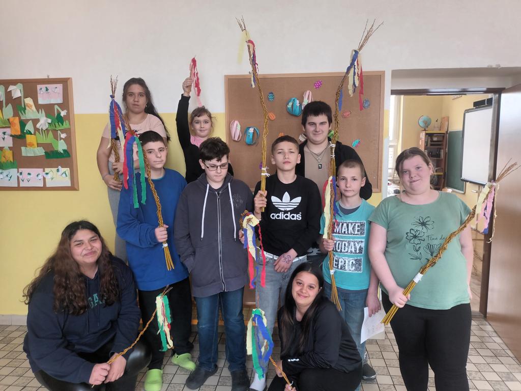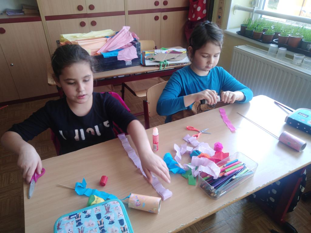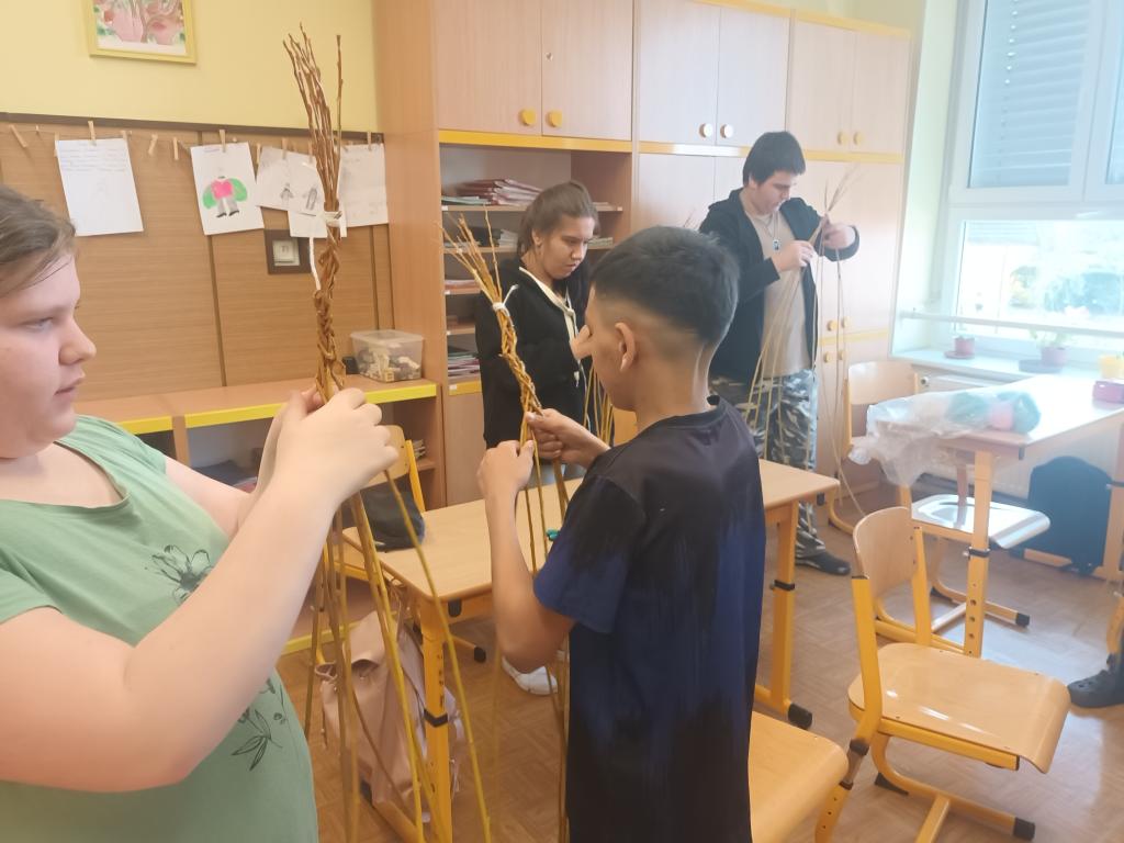 Před Velikonocemi děti zažily velikonoční povídání, zpívání a vyrábění. Pomocí různých materiálů vyrobily zápichy do vyklíčených květináčů, upletly si pomlázku a z korálků si vytvořily velikonoční ozdoby na pověšení.