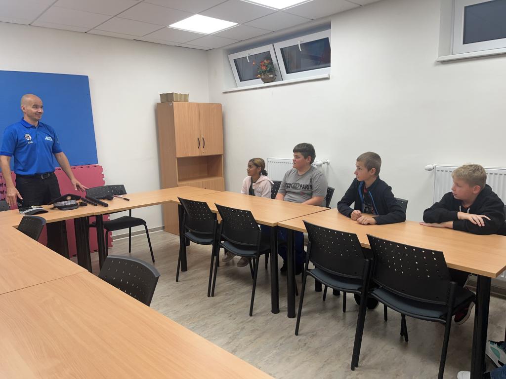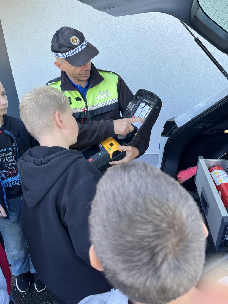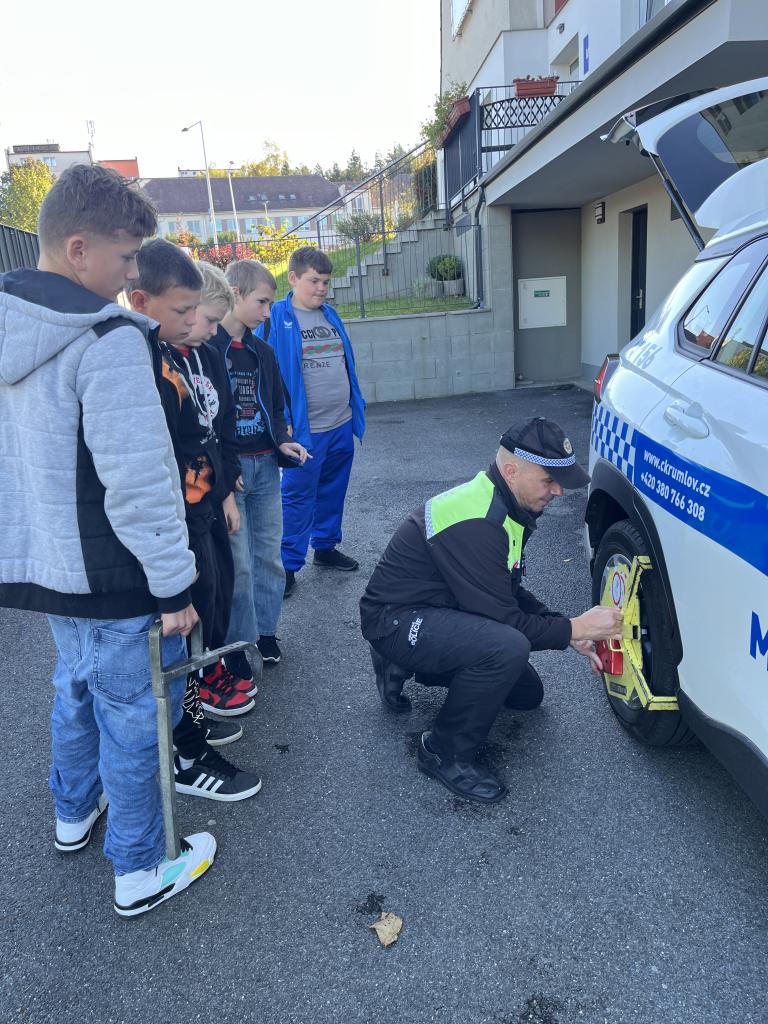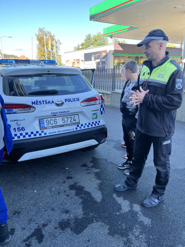 Ve středu 25.9.2024 jsme se zúčastnili vzdělávacího programu: Den s městskou policií. Žáci se dozvěděli o práci městských policistů. Zkusili si jaké to je mít na rukách pouta, nebo být v cele. Podívali jsme se na kamerový systém ve městě a také na vybavení auta městské policie.