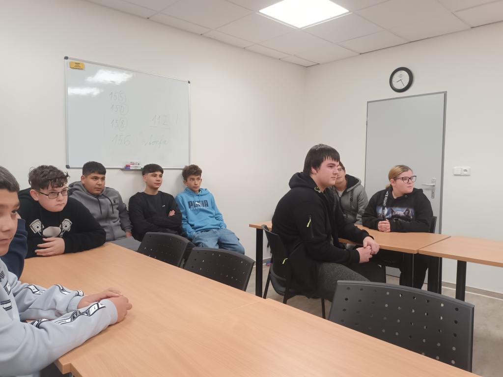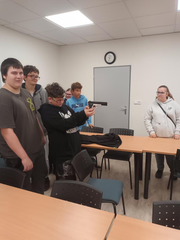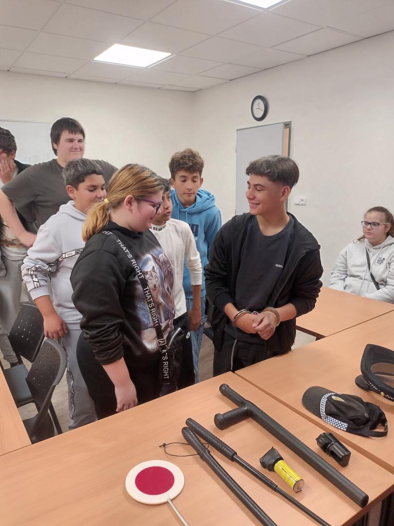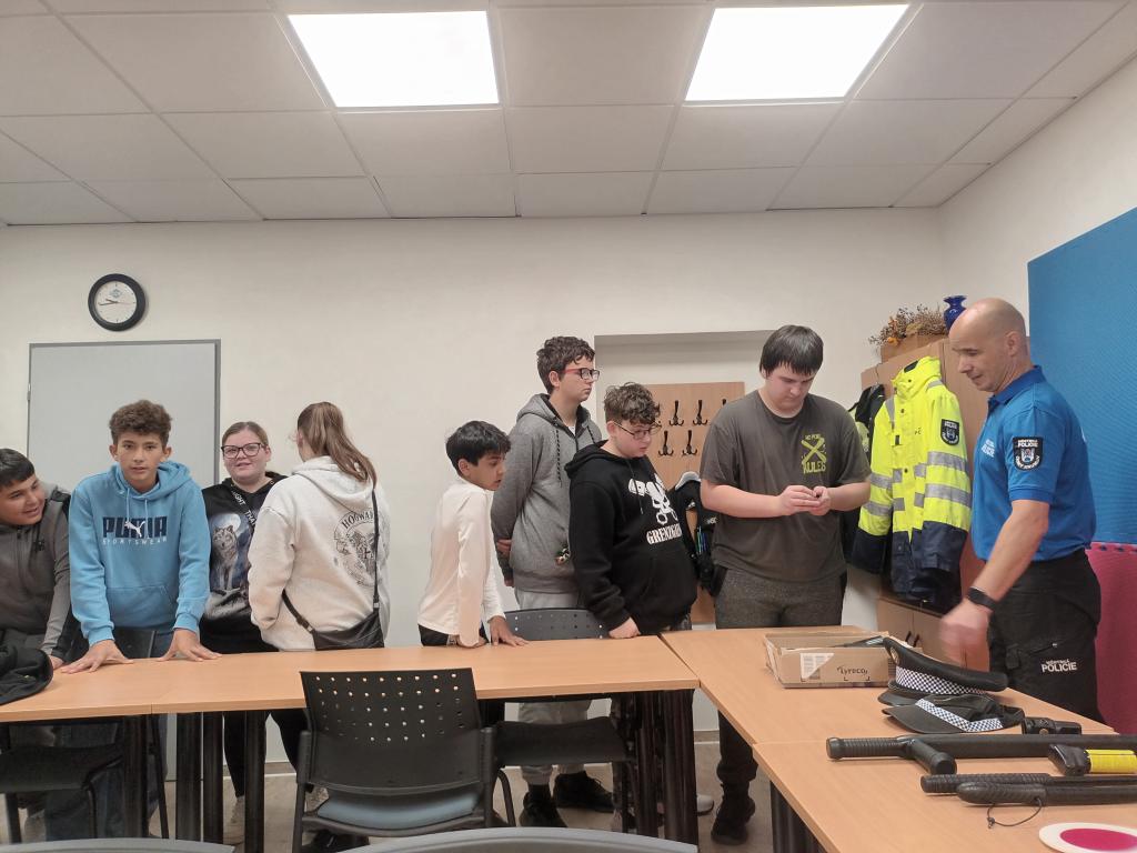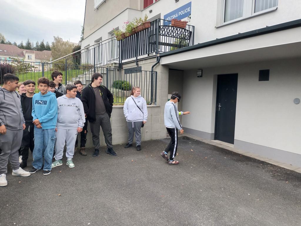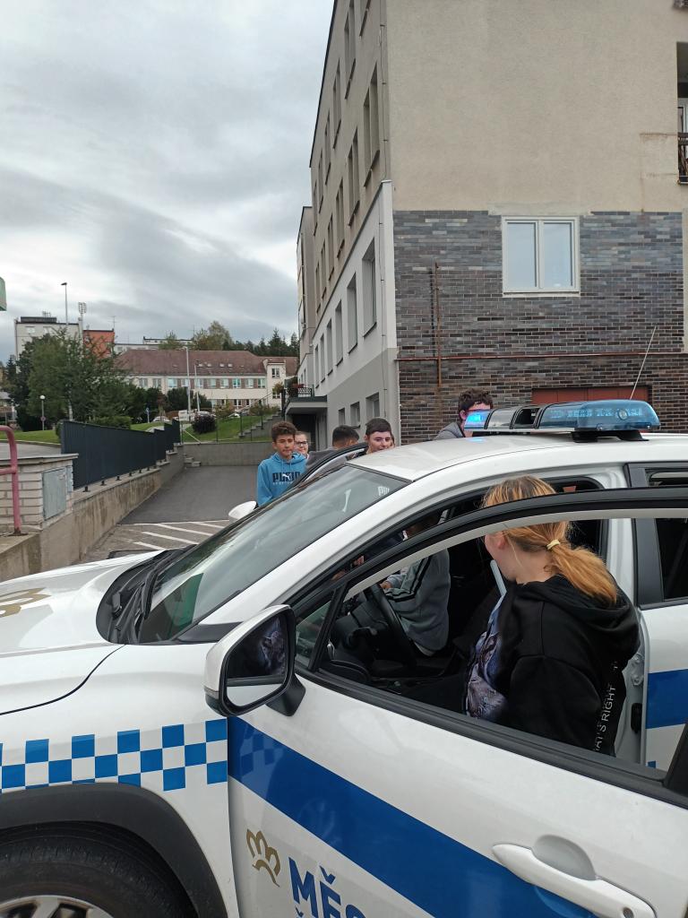 Ve čtvrtek 27.9. vyrazili žáci deváté třídy na služebnu Městské policie Český Krumlov. Pan policista ukázal dětem, jak vypadá policejní služebna, jakou práci v ní policisté vykonávají, jaké používají pomůcky. Děti si mohly vyzkoušet pouta, potěžkat si obušek, zkoušeli střílet na terč, běhali překážkovou dráhu se speciálními brýlemi, které simulují opilost. Závěrem byla možnost posadit se do policejního automobilu a zapnout majáky. Krom nevšedních zážitků a poučení si žáci odnesli také velké upomínkových předmětů.