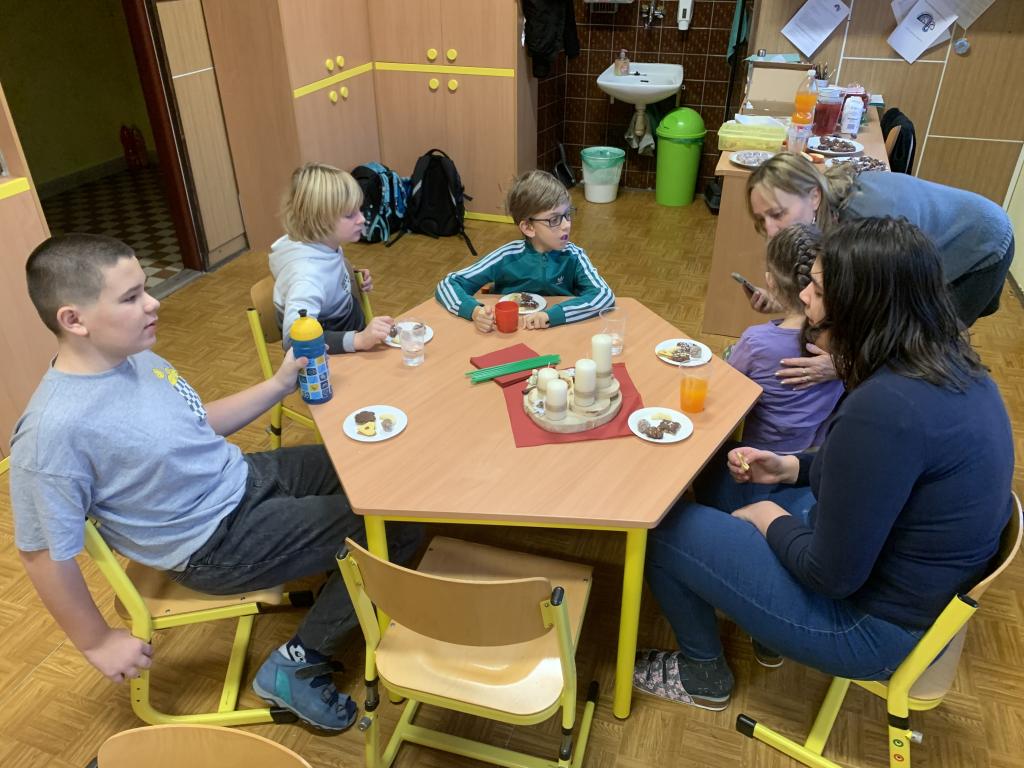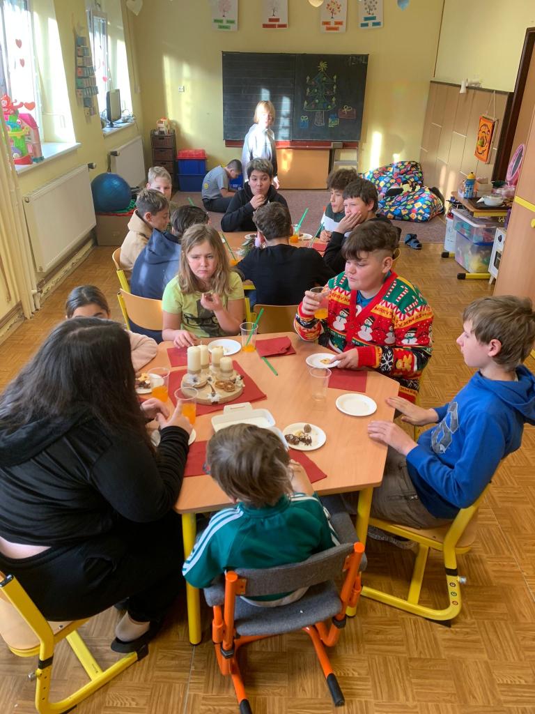 Ve čtvrtek 19. 12. postupně všechny třídy navštívili „vánoční kavárnu“, ve kterou se proměnila naše školní družina. Pohoštění připravili žáci a žákyně ze speciálních tříd. Popovídali jsme si o zvycích a tradicích a vyrobili jsme malý dáreček a nazdobili perníčky. Příjemnou atmosféru doprovázely koledy.
