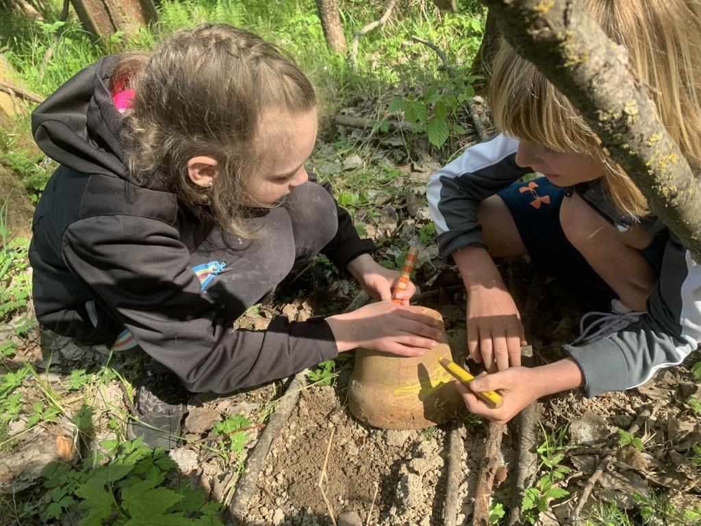 Dne 2.5. se třídy II. S, III.S a VII.S vydaly na otvírání studánek. Cestou děti hledaly místa z fotografií a na konci získaly pozdrav bohu Lomikelovi a sladkou odměnu. U pramene jsme postavili žabí domečky a odstranili napadané větve. Na závěr jsme si opekli buřty a namalovali, jak vypadá bůh Lomikel.